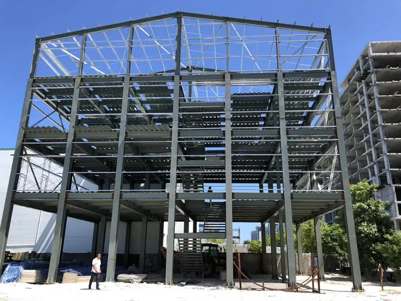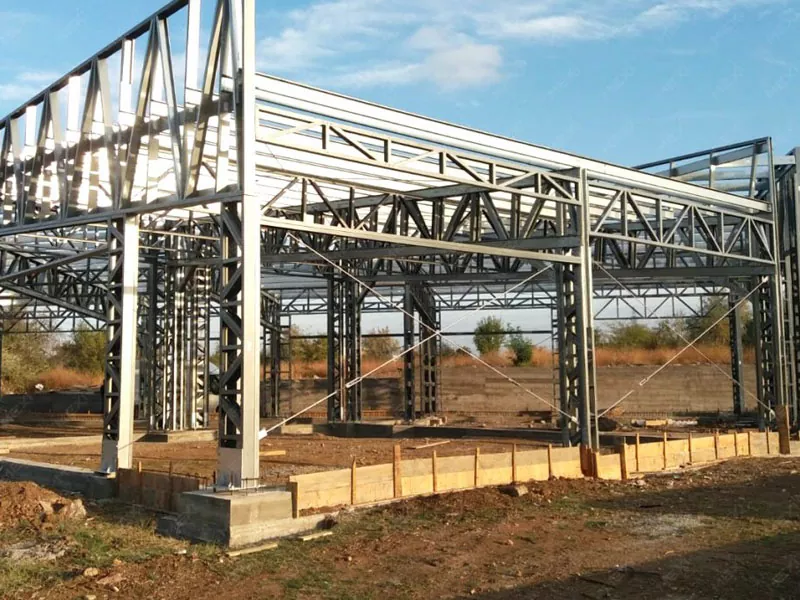 4. Төмөр хийцийг суурилуулах Угсармал ган эд ангиудыг барилгын талбай руу зөөвөрлөж, кран болон бусад хүнд тоног төхөөрөмж ашиглан угсардаг. Суурилуулалтын процесс нь баганыг суурь дээр босгож, бэхлэхээс эхэлдэг бөгөөд дараа нь агуулахын хүрээ үүсгэх дам нурууг суурилуулна. Дараа нь дээврийн фермүүд нь дээврийн системийг дэмжихийн тулд бэхлэгдсэн байна.