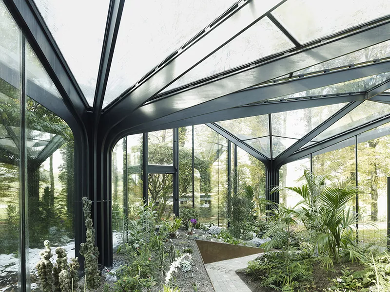 Байгалийн гэрэл ба агааржуулалт: ган байгууламжийн дизайн нь ихэвчлэн том цонх, дээврийн цонх, эсвэл тунгалаг дээврийн хавтангуудыг багтаасан бөгөөд ургамлыг хангалттай гэрэлтүүлж, танхим доторх агааржуулалтыг хангадаг.